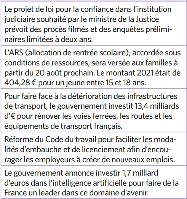 La réforme des modalités d'organisation de l'enseignement supérieur permettant une meilleure employabilité à la sotie des études universitaires. La prime à la conversion accordée pour l'achat d'un véhicule électrique. Les nouvelles mesures de durcissement des règles d'indemnisation de l'assurance chômage et dégressivité des indemnités pour les plus hauts salaires.