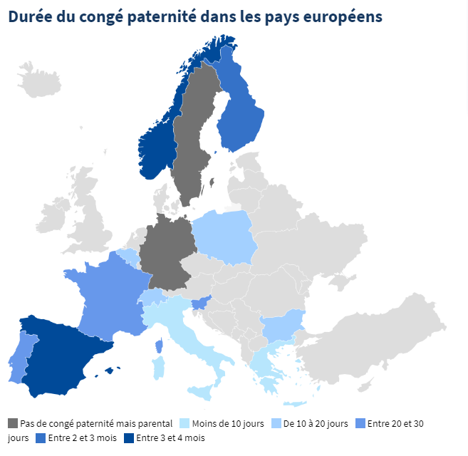 1. A l'aide des documents 1 et 2, retrouvez le nombre de jours de congés paternité proposés en France.
