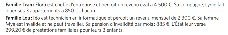 3. A l'aide du document 4, sachant que les prélèvements obligatoires de la famille Tran sont de 2.500€ et ceux de la famille Lou de 120€, calculez le revenu disponible de chaque famille.