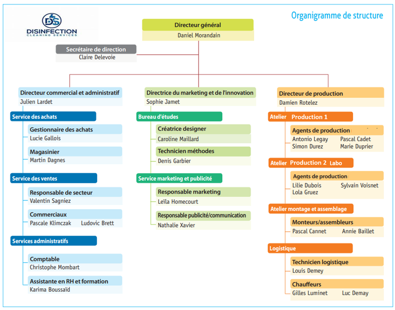 1. A l'aide du document 1, retrouvez combien d'employés travaille au service production ? Qui est à la tête du service des ventes ? Qui est le supérieur hiérarchique de Gilles Luminet, chauffeur dans l'entreprise ? Quel est l'effectif de l'entreprise ?