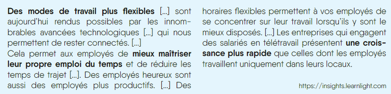 Expliquez à Madame Di Napoli les différentes modalités et les avantages que va impliquer ce nouveau mode de travail ?