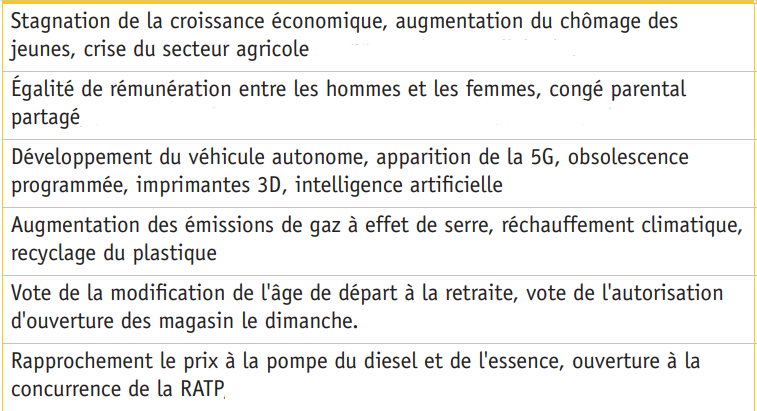 1. A l'aide du document 1, qualifiez pour chaque évènements suivant s'il est économique, politique, socio-culturel, technologique, environnemental ou législatif.