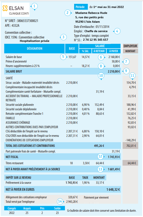 4. A l'aide du document 5, le bulletin de salaire de Madame Hude, retrouvez chaque ligne parmi les suivantes :